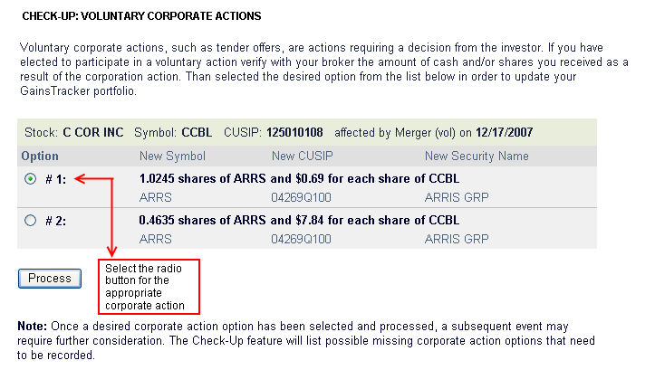 If this alert displays on the Check-Up page, it means that a decision is required regarding a voluntary corporate action, such as a tender offer. If you have elected to participate in a voluntary action, verify the amount of cash and/or shares you received as a result of the corporate action, with your broker. Select the appropriate option from the list displayed on the Check-Up: Voluntary Corporate Actions page, in order to update your portfolio.