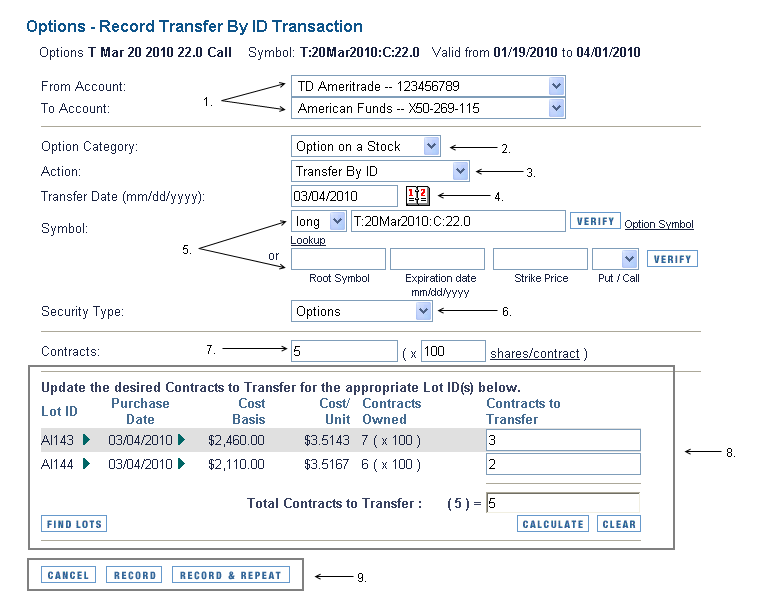 Enter the number of contracts to transfer in the Contracts field. The default information used is the standard 100 shares per contract. If your option has a different set up, enter the number of shares per contract associated with your option in the field provided. It is important that this figure is accurate to ensure correct calculations for this option transaction.